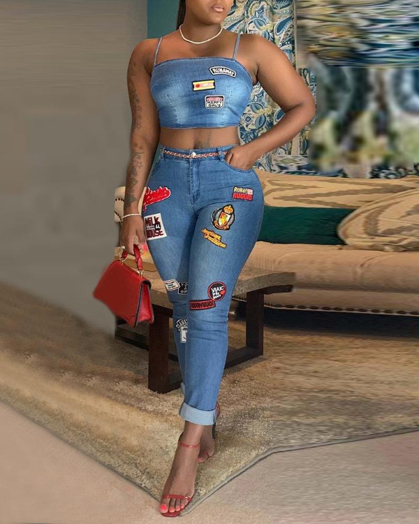 Patched Denim Cami Top High Waist Jeans Set Online Discover